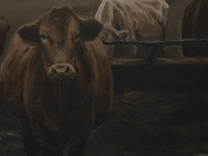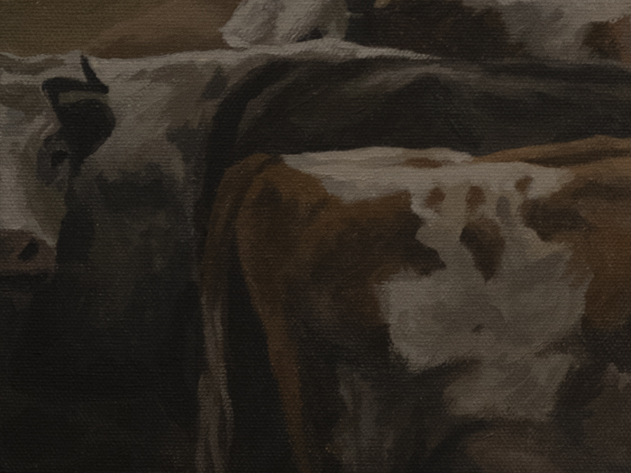 Behind her, the herd grazes in silence, and behind them, the forest exhales in layers of grey.